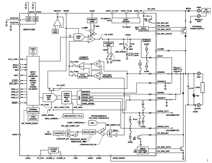 該設備配備一個16位Σ-Δ模數轉換器(ADC)和一個14位數模轉換器(DAC)。AD74115H包含一個高精度2.5 V片上基準電壓源,可用作DAC和ADC的基準。