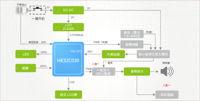 航順HK32C030胎心儀MCU方案和原理框圖說明