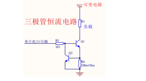 三極管的恒流電路,主要是利用Q2三極管的基極導(dǎo)通電壓為0.6 ~ 0.7V的特性來實(shí)現(xiàn)的。當(dāng)三極管Q2導(dǎo)通時(shí),三極管Q1的基極電壓被拉低,導(dǎo)致三極管Q1截止,因此負(fù)載R1不能工作。當(dāng)Q2三極管導(dǎo)通時(shí),Q1三極管截止,因此負(fù)載R1沒有工作。負(fù)載R1流過的電流等于R6電阻的電流,而R6電阻的電流等于R6電阻兩端的0.6~0.7V電壓除以R6電阻阻值(固定不變)。因此,即使R1負(fù)載的電源端VCC電壓是可變的,流過R1負(fù)載的電流也能保持恒定不變,達(dá)到恒流的電路效果。