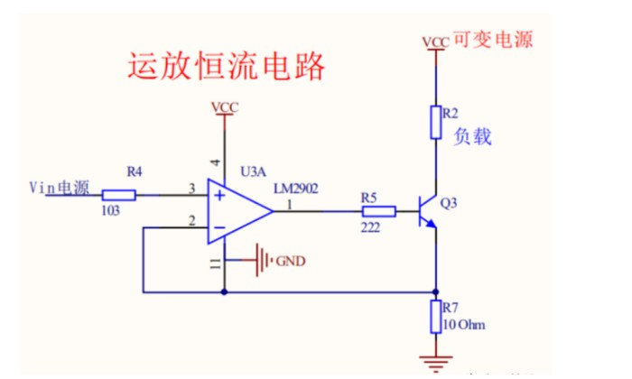 運(yùn)放的恒流電路主要是利用運(yùn)放的“電壓跟隨特性”,即運(yùn)放的兩個(gè)輸入引腳Pin3與Pin2之間的電壓相等的特點(diǎn)來實(shí)現(xiàn)的。當(dāng)在電阻R4上輸入穩(wěn)定的電源電壓Vin時(shí),電阻R7兩端的電壓也為Vin,因此無論外界電路如何變化,流過R7電阻的電流是不變的。