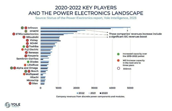 Yole集團旗下半導體市場研究公司Yole Intelligence發布的功率半導體市場研究報告《Status of the Power Electronics 2023》包含了2020年至2022年功率半導體供應商(分立+模塊)的銷售排名。