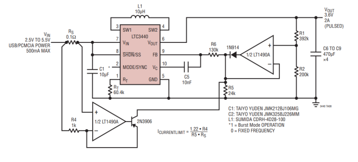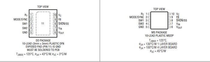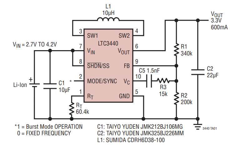 該器件的其他特點包括 1μA 的停機電流、軟起動控制、熱停機和電流限制功能。LTC3440 采用 10 引腳耐熱性能增強型 MSOP 封裝和 (3mm x 3mm) DFN 封裝。