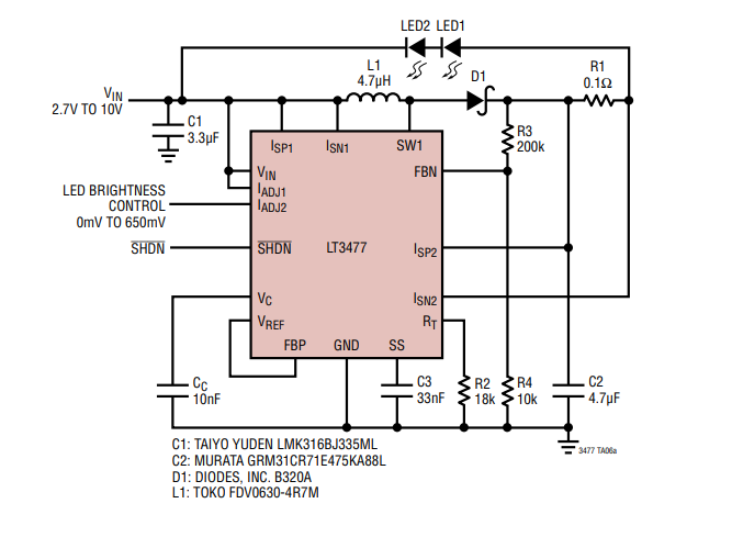 10V至2個白色LED:帶PWM調光的降壓-升壓模式