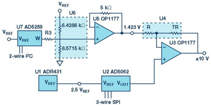 精密DAC適合于要求1LSB(最低有效位)或更小誤差的高精度、高達20位分辨率的應用;Nano DAC是ADI受歡迎的低壓單電源產品系列,功耗低,解決方案尺寸最小,適合于需要高密度且存在空間限制的應用;digiPOT系列產品可以用于簡化開環應用或匹配容差,提供易失性和非易失性存儲解決方案,支持最多1024位調整應用;直接數字頻率合成和阻抗轉換器可提供快速采集和高精度調諧分辨率,DDS的目標應用是需要精密或敏捷的頻率和相位控制的應用。ADI還有乘法DAC輸出和雙極性DAC產品系列,可提供快速建立特性和最高+/-10V的寬輸出范圍。乘法DAC是電流輸出DAC,需要緩沖器才能轉換為輸出電壓,此類DAC允許將AC或DC輸入信號用作基準電壓;工業DAC提供廣泛的可編程輸出范圍,從適合標準電流環路通信的4-20mA到適合執行器控制的±10 V,還能與ADI HART調制解調器相結合,為過程控制和工廠自動化應用提供可靠且精確的解決方案。下面是兩個應用實例。