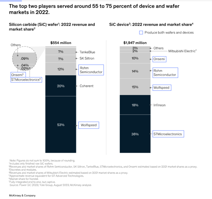 電動汽車以及SiC市場預測麥肯錫從2018年到2022年之間的數據預測,到2030年電動汽車在全球輕型汽車市場中的份額將增長3.8倍,從大約1700萬輛增加至6400萬輛,市場份額從2022年的19%增長至2030年的67%。預計到2024年或2025年,多個國家的電動汽車總擁有成本將會與內燃機汽車持平,這樣的預期也推動了電動汽車市場的增長。SiC在電動汽車中主要被應用于逆變器、DC-DC、OBC等核心部件上。相比以往的硅功率器件,SiC功率器件能夠提供更高的開關頻率、熱阻和擊穿電壓,從而有效提高電動汽車的工作效率并降低系統總成本。因此,隨著電動汽車市場的增長,SiC也將迎來高增長階段。麥肯錫報告顯示,SiC器件市場在2022年的價值約為20億美元,預計到2023年將達到110億美元至140億美元,年均復合增長率預計達到26%。麥肯錫預計,市場上70%的SiC需求將來自電動汽車,并認為中國是電動汽車需求最高的國家,將占到電動汽車SiC總需求的40%左右。由于對耐壓以及效率的需求,目前800V平臺的電動汽車上SiC器件的使用比例較高。報告分析稱,到2030年,純電動汽車(BEV)預計會占新能源汽車產量的75%,而混合動力(HEV)和插電混動(PHEV)汽車將占其余的25%。另外,到2030年,800V平臺的滲透率將超過50%。SiC行業趨勢:走向IDM,8英寸晶圓滲透率提高目前SiC市場高度集中,SiC襯底和器件市場上的前兩家公司就壟斷了大約60%到65%的SiC市場份額。其中,SiC市場的主要玩家采用IDM模式。根據麥肯錫的分析,SiC襯底和器件制造中采用IDM模式,能夠將產量提高5%至10%,利潤提高10%至15%。其中的原因包括更低的損耗率,同時還有在制造過程中的每個步驟中消除邊際堆疊。通過更好地控制設計,并與晶圓和器件制造之間的閉環反饋實現更快的產量提升,可以實現更高的良率。從戰略上看,IDM廠商能夠為汽車OEM提供更穩定的供應,這在供應鏈中具備很大的優勢。包括意法半導體收購Norstel、安森美收購GT Advanced Technologies (GTAT)和羅姆收購SiCrystal,都展示出SiC廠商布局IDM的趨勢。在SiC晶圓方面,麥肯錫預計從6英寸晶圓向8英寸晶圓的轉變將在2024年或2025年左右開始,到2030年8英寸SiC晶圓的市場滲透率將達到50%。一旦制造商成功克服了技術挑戰,8英寸晶圓將為他們帶來豐厚的利潤收益,同時減少邊緣損耗,提高生產效率,并能夠充分利用硅制造中的折舊資產。根據我們對垂直整合程度的不同估計,這種轉變所帶來的利潤增長幅度大約在5%至10%之間。美國領先的制造商預計將于2024年和2025年開始批量生產8英寸晶圓,隨后這種生產將迅速增長。主要推動因素包括應對需求和價格壓力(特別是來自中等規模電動汽車制造商),以及通過轉向8英寸碳化硅晶圓制造實現的成本節約。分析結果顯示,由于產量較低,與6英寸晶片相比,目前8英寸晶片襯底的單位價格仍相對較高。然而,隨著工藝產量的提升和新晶片技術的引入,領先制造商在未來十年內有望縮小這一差距。例如,麥肯錫發現相較于傳統的多線鋸晶片切割技術,激光切割技術有望將一個單晶毛坯生產的晶片數量提升一倍以上。此外,先進的晶片技術如氫分裂等也有望進一步提高產能。中國本土供應商未出現行業領先者目前在中國SiC市場上,80%的襯底/晶圓以及95%以上的器件來自海外供應商,不過由于考慮到地緣政治以及供應穩定,中國汽車OEM正在加速尋求本土供應商。鑒于可見的產能擴張和器件技術性能,預計到2030年,中國汽車OEM廠商將廣泛轉向本地供應商采購,從目前的約15%提高到約60%。在整個碳化硅價值鏈中,從設備供應到晶圓和器件制造,再到系統集成,中國企業的崛起將推動中國向本地采購的轉變。中國的設備供應商已經覆蓋了所有主要的碳化硅制造步驟,并已宣布投資提升產能至2027年。不過,麥肯錫也認為,在中國的SiC行業中尚未出現明確的供應領導者。