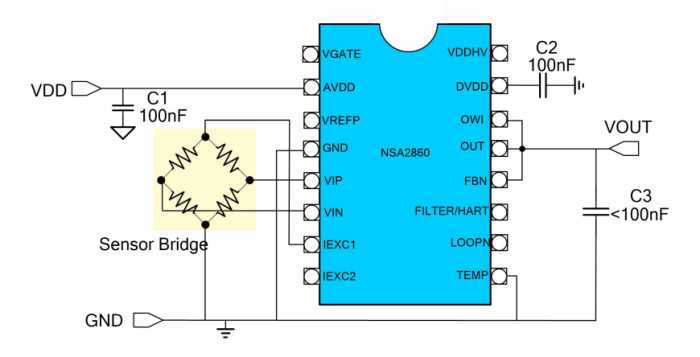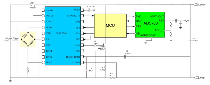 納芯微NSA2860是一顆高集成度的用于阻式或者電壓 型傳感器例如阻式壓力傳感器,熱電偶,RTD 等傳感器信號(hào)調(diào)理和變送輸出的專(zhuān)用芯片。 NSA2860集成了外部JFET控制器,24位主信號(hào) 測(cè)量通道和24位輔助溫度測(cè)量通道,傳感器校 準(zhǔn)邏輯,雙路恒流源等電路,并可以支持?jǐn)?shù)字 接口輸出,模擬電壓輸出,4~20mA變送輸出,PWM/PDM輸出等各種輸出模式。高集成 度和巧妙的接口方案,使得NSA2860僅需最少 的外部器件,即可實(shí)現(xiàn)壓力或溫度變送模塊的 校準(zhǔn)和變送。通過(guò)內(nèi)置的MCU,NSA2860支持 對(duì)傳感器的零點(diǎn),靈敏度的二階溫度漂移校準(zhǔn) 以及最高三階的非線性校準(zhǔn),校準(zhǔn)精度可以達(dá) 到0.1%以內(nèi),其校準(zhǔn)系數(shù)存儲(chǔ)于一組EEPROM 中。