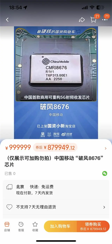 《科創(chuàng)板日?qǐng)?bào)》記者今日注意到,在國(guó)資委淘寶店鋪“國(guó)資小新”內(nèi),上架了一款中國(guó)移動(dòng)“破風(fēng)8676”芯片,該款芯片是中國(guó)首款商用可重構(gòu)5G射頻收發(fā)芯片,淘寶售價(jià)為999999元,不過(guò),現(xiàn)在只能展示加購(gòu)不能購(gòu)買(mǎi)。