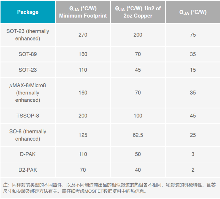 我們可以從MOSFET的ΘJA規格開始。對于單一管芯、8引腳封裝的MOSFET來講,ΘJA通常接近于62°C/W。其他類型的封裝,有些帶有散熱片或裸露的導熱片,其熱阻一般會在40°C/W至50°C/W (表1)。