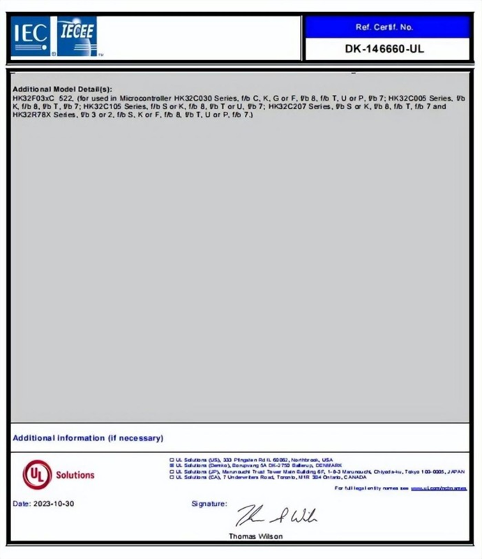 HK32C030/C005/C105/C207/R78X系列產(chǎn)品通過了IEC 60730認(rèn)證,可提供符合CLASS B標(biāo)準(zhǔn)的功能安全庫,為智慧家電廠商減少終端產(chǎn)品安全認(rèn)證的時間與成本,助力縮短產(chǎn)品上市時間,從底層提高產(chǎn)品的穩(wěn)定性和安全性。