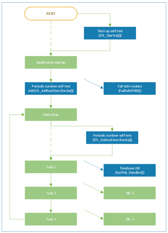 在正常情況下,程序運(yùn)行會通過Reset復(fù)位開始, 經(jīng)歷綠色框部分來完成所有的功能,其中包括了應(yīng)用app的啟動配置, Main函數(shù)的功能執(zhí)行以及多個中斷的執(zhí)行判斷。為了實現(xiàn)IEC 60730的安全功能,我們在程序中增加了藍(lán)色部分,其中包括Reset后的模塊安全啟動檢測以及運(yùn)行時的周期檢測,同時增加了失敗判斷接口,如功能安全軟件總體流程圖所示。