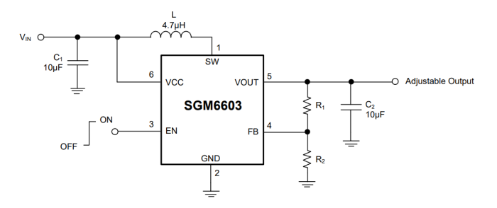 SGM6603-ADJ的輸出電壓可以通過外部電阻分壓器進行編程,SGM6603-3.3/SGM6603-5.0的輸出電壓內部固定在芯片上。該設備有綠色SOT-23-6包裝。它在-40℃至+85℃的環境溫度范圍內運行。