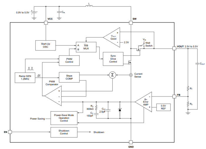 SGM6603在輕負載時進入省電模式,以保持高效率。抗振鈴控制電路通過在不連續模式下阻尼電感器來減少EMI問題。SGM6603提供真正的輸出斷開,允許VOUT在關閉期間變為0V,而無需從輸入源汲取任何電流。