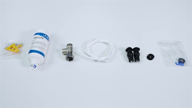 除了主體機身外商家還贈送了進水口過濾器、進水口水管、水管轉接頭以及一對固定螺絲和墊片。
