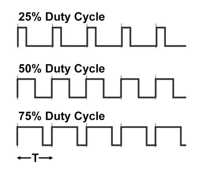 PWM的頻率:指的是1秒鐘內(nèi)信號(hào)從高電平到低電平再回到高電平的次數(shù),也就是1秒鐘時(shí)間PWM有多少個(gè)周期。