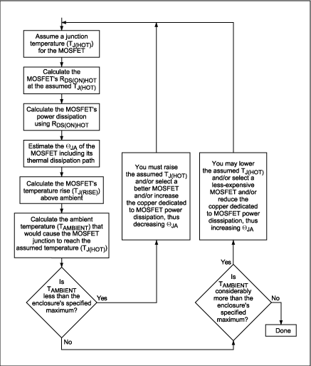 圖1. 該流程圖展示了選擇各MOSFET (同步整流器和開關(guān)MOSFET)的迭代過程。在這個(gè)過程中,各MOSFET的結(jié)溫為假設(shè)值,兩個(gè)MOSFET的功率耗散和允許環(huán)境溫度通過計(jì)算得出。當(dāng)允許的環(huán)境溫度達(dá)到或略高于我們所期望的機(jī)箱內(nèi)最高溫度時(shí)(機(jī)箱內(nèi)安裝了電源及其所驅(qū)動(dòng)的電路),這個(gè)過程就結(jié)束了。