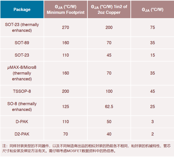 表1. MOSFET封裝的典型熱阻