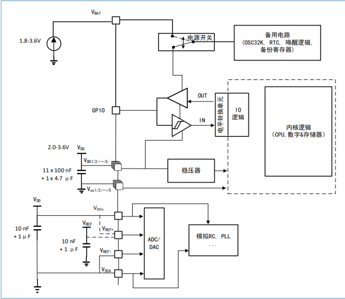 ? 雙電源域:主電源 VDD為 2.0 V ~ 3.6 V、備份電源 VBAT 為 1.8 V ~ 3.6 V。