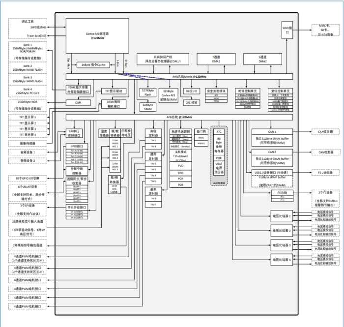 ? 自定義 DBGMCU 調試控制器(低功耗模式仿真控制、調試外設時鐘控制、調試及跟蹤接口 分配)。