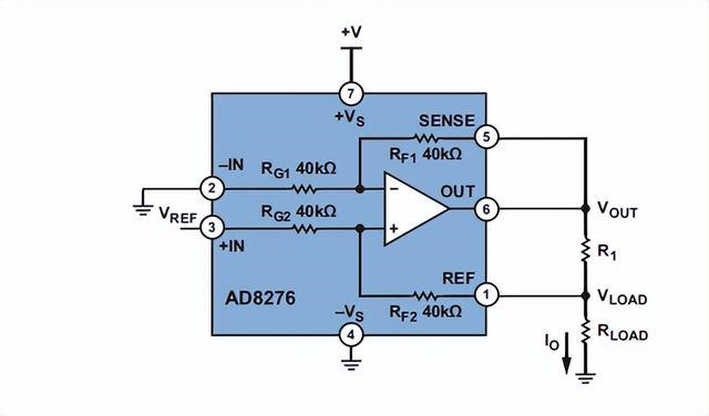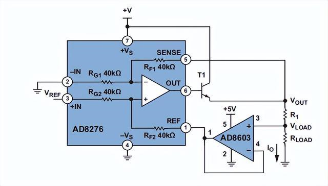 精密電流源傳統(tǒng)上采用運(yùn)算放大器、電阻和其它分立器件構(gòu)建,但存在尺寸、精度和溫度漂移等方面的不足。如今,高精度、低功耗、低成本集成差動(dòng)放大器的AD8276使得尺寸更小、性能更高的電流源變成現(xiàn)實(shí)(如圖5)。反饋緩沖器使用低失調(diào)、低偏置電流放大器,例如ADA4098-2、ADA4622-2、AD8610、AD8603等具體取決于所需電流范圍。