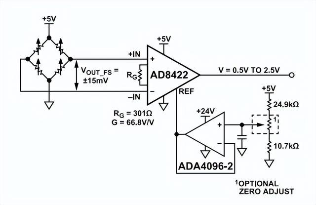 AD8422是業(yè)界標(biāo)準(zhǔn)AD620發(fā)展到第三代的產(chǎn)品。具有極低的偏置電流,高源阻抗時(shí)不會(huì)產(chǎn)生誤差,允許多個(gè)傳感器多路復(fù)用至輸入端。低電壓噪聲和低電流噪聲特性使AD8422成為測(cè)量惠斯通電橋的理想選擇。