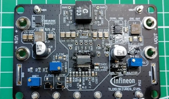 隨著LED工藝技術的發展,LED應用也越來越廣泛,與之對應的LED驅動技術也在不斷發展,而汽車LED驅動的要求也要比民用照明的LED驅動的要求高得多,民用照明的LED驅動甚至只需要一個整流電路即可接入燈珠串,但是對于由電池供電的汽車LED就不能滿足需求。英飛凌作為汽車電子的主要元件廠商,近年來推出了很多高效、安全、功能豐富的LED驅動控制芯片,今天要說的這塊TLD5191IVREG-EVAL評估板,就是以英飛凌TLD5191為控制核心的。