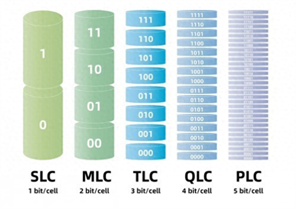 按容量大小對比排序:PLC>QLC>TLC>MLC>SLC