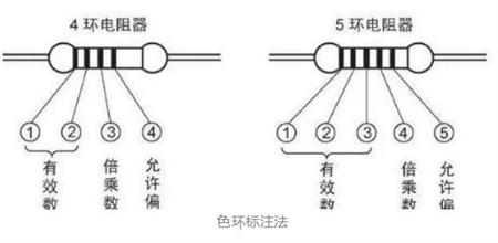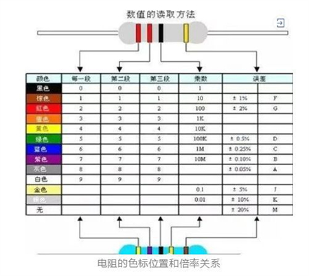 2、色環標注法使用最多,第一道色環表示阻值的最大一位數字,第二道色環表示第二位數字,第三道色環表示阻值未應該有幾個零,第四道色環表示阻值的誤差。
