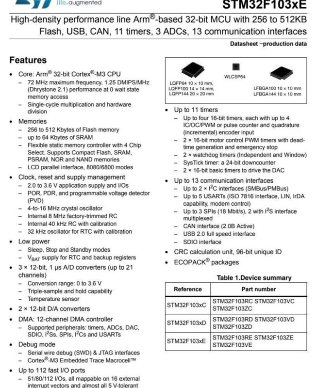 此頁可以看到STM32F103xC,STM32F103xD,STM32F103xE等芯片參數簡介,