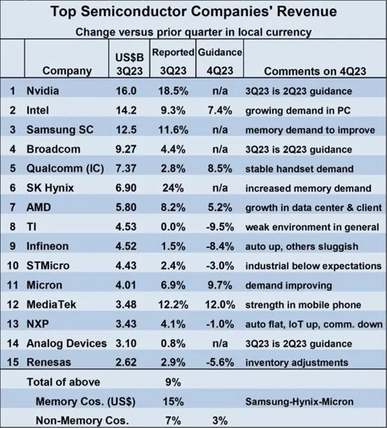 排名Top15的半導體公司均報告了 23 年第 3 季度的收入比 23 年第 2 季度有所增長。增長率從德州儀器(TI)和ADI公司的不到1%到英偉達(Nvidia)、三星(Samsung)、SK海力士(SK Hynix)和聯發科(Media Tek)的兩位數不等。