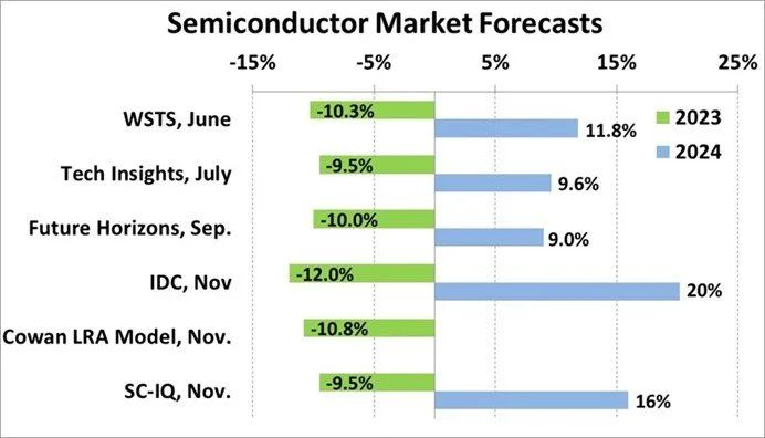 對 2023 年半導體市場變化的預測在負 9% 至負 12% 的范圍內。Semiconductor Intelligence的半導體智能(SC-IQ)預測為負9.5%。進入 2024 年的勢頭是顯而易見的。對 2024 年的預測范圍從 Future Horizons 的 9% 到 IDC 的 20% 不等。我們的 SC-IQ 預測是增長 16%。決定 2024 年是接近 9% 還是 20% 的一個主要因素是內存價格上漲的程度。