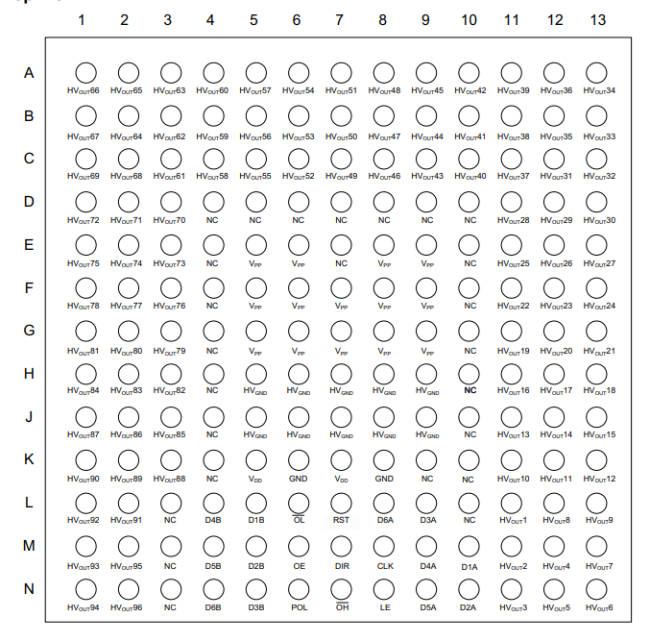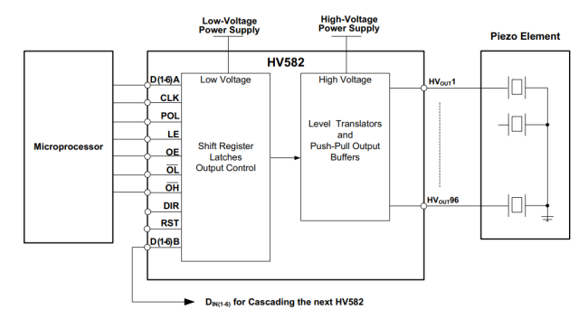 該器件由六個并行的16位移位寄存器、一個96位鎖存器和96個高壓輸出組成。移位寄存器工作在30MHz,由于并行排列,允許180MHz的數據速率。