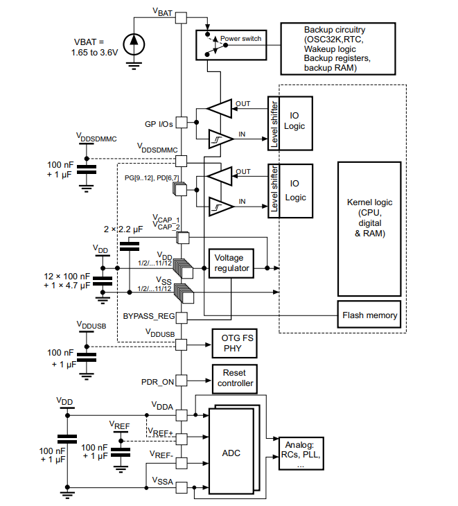 STM32F722VCT6微控制器的工作溫度范圍為–40至+85°C,電源電壓為1.7至3.6 V。USB(OTG_FS和OTG_HS)和SDMMC2(時鐘、命令和4位數據)的專用電源輸入可用,以提供更大的電源選擇。