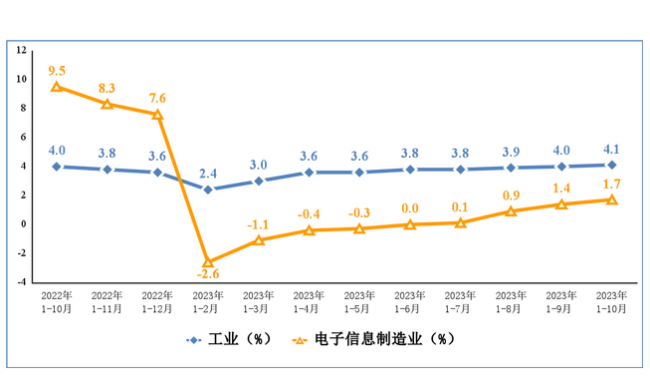 1-10月份,我國規(guī)模以上電子信息制造業(yè)增加值同比增長1.7%,增速較前三季度提高0.3個百分點;增速分別比同期工業(yè)、高技術制造業(yè)低2.4個和0.2個百分點。10月份,規(guī)模以上電子信息制造業(yè)增加值同比增長4.8%,較同期工業(yè)高0.2個百分點。