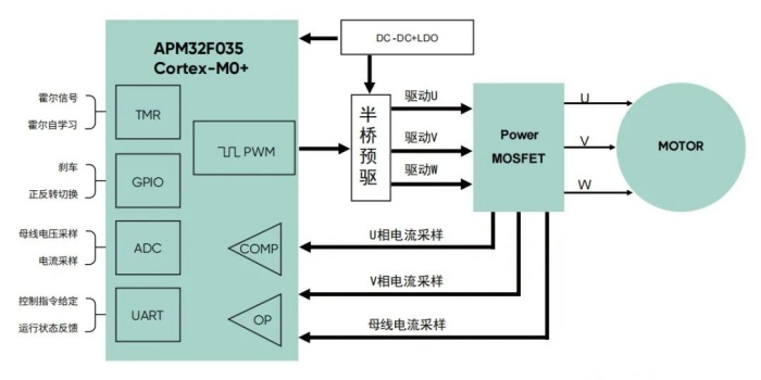 極海APM32F035電機控制專用MCU作為此應(yīng)用方案的主控,負責采集霍爾信號、電流、電壓信號,執(zhí)行電機控制邏輯,接收控制指令以及反饋電機運行狀態(tài)。具體來說,APM32F035通過檢測霍爾信號、母線電壓信號以及電機的相電流信號,輸入到MCU內(nèi)部,同時在MCU內(nèi)執(zhí)行電機算法邏輯;隨后通過Timer1輸出6組互補的PWM信號來驅(qū)動電機,保障電機高效、平穩(wěn)、低噪聲運行。值得說明的是APM32F035內(nèi)部集成4路獨立運放模塊,在進行電機相電流采樣時,不需要外置運放進行信號調(diào)制。