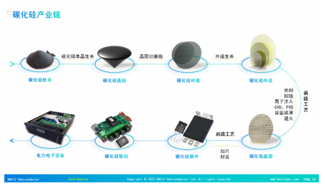 碳化硅產(chǎn)業(yè)鏈涵蓋多個(gè)環(huán)節(jié),從碳化硅高純粉末到碳化硅器件,碳化硅要經(jīng)過(guò)切、磨、拋、外延生長(zhǎng)、光刻、刻蝕等多道工序,如果是開(kāi)關(guān)器件還要驅(qū)動(dòng)集成到設(shè)備里。