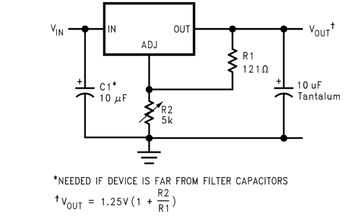 需要兩個電阻器來設(shè)置LM1084IS-3.3的可調(diào)輸出電壓版本的輸出電壓。固定輸出電壓版本集成了調(diào)節(jié)電阻器。