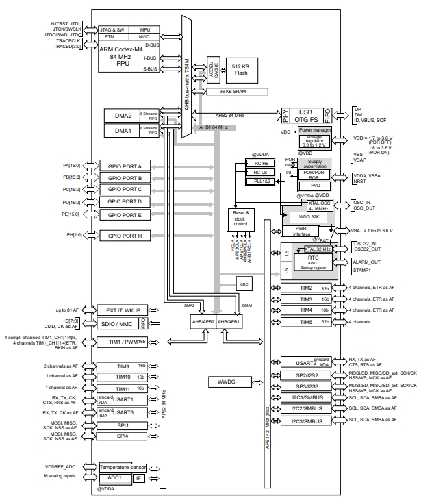 STM32F401CEU6TR包含高速嵌入式存儲器(512KB閃存,96KB SRAM),以及連接到兩條APB總線、兩條AHB總線和32位多AHB總線矩陣的大量增強型I/O和外圍設備。