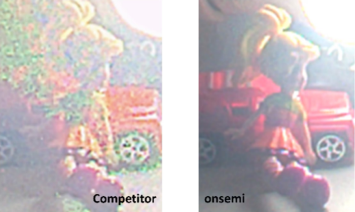 圖 1:競爭對手的傳感器(左側)與安森美 ART0220AT(右側)的對比。請注意左側圖中的低光性能下降和出現偽影