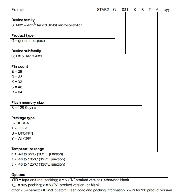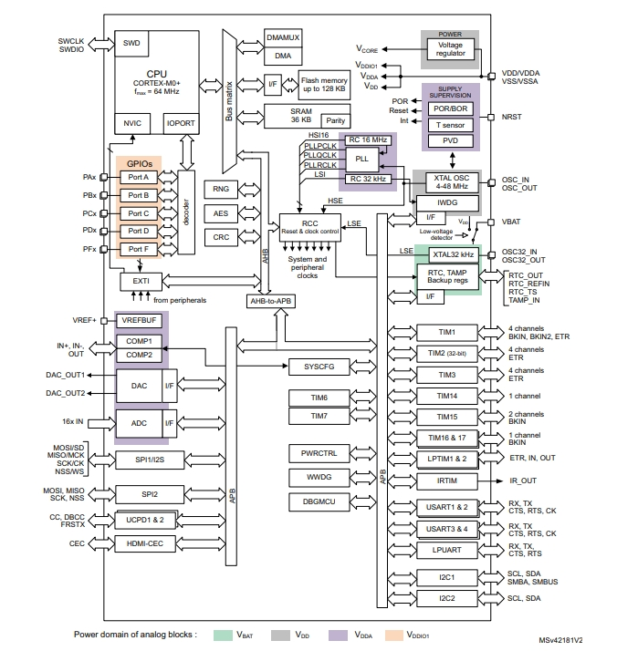 STM32G081RBT6包括存儲器保護單元(MPU)、高速嵌入式存儲器(36KB的SRAM和128 KB的閃存程序存儲器,具有讀保護、寫保護、專有代碼保護和安全區域)、DMA、廣泛的系統功能、增強的I/O和外圍設備。