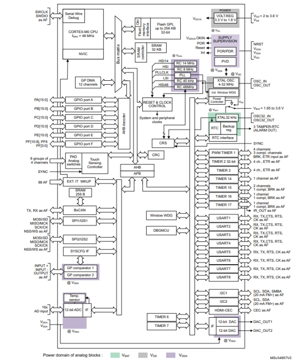 STM32F091CCT6TR提供標準通信接口(兩個i2c,兩個spi /一個I2S,一個HDMI CEC和多達8個usart),一個CAN,一個12位ADC,一個帶兩個通道的12位DAC, 7個16位計時器,一個32位計時器和一個高級控制PWM計時器。STM32F091CCT6TR微控制器工作在-40到+85°C和-40到+105°C的溫度范圍內,從2.0到3.6V電源。一套全面的省電模式允許設計低功耗應用程序。