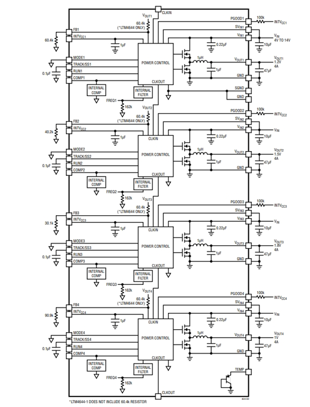 LTM4644IY#PBF外部偏置供電,輸入電壓范圍為4V~14V或2.375V~14V,輸出電壓范圍為0.6V~5.5V。其高效率的設計提供了每個通道4A連續(xù)(5A峰值)的輸出電流,只需要大量的輸入和輸出電容。