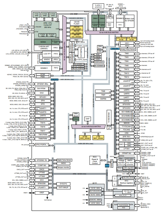 高性能處理能力:搭載了Cortex-M7內(nèi)核,最高主頻可達(dá)280MHz,具備高性能的浮點(diǎn)運(yùn)算能力和指令集擴(kuò)展。