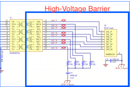 ? 實(shí)現(xiàn)地分割以進(jìn)行高壓安裝(不需要集成磁件)。通常,在 PCB 上磁件到 RJ45 連接器的中間區(qū)域清除所有平面。TRxP/TRxN對(duì)應(yīng)是這一清除區(qū)域中僅有的走線,從而形成LAN應(yīng)用所需的高壓勢(shì)壘的一部分。