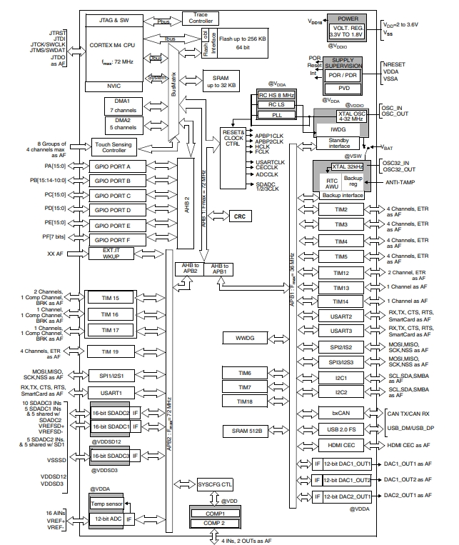STM32F373VCH6可以在-40~+85℃和-40~+105℃的溫度范圍內在2.0~3.6V電源范圍內工作。