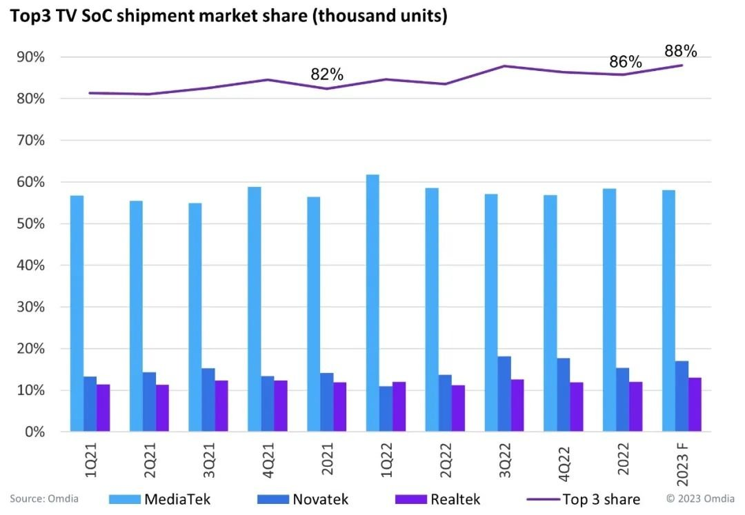 前三大電視芯片供應(yīng)商之市場(chǎng)占有率將更為集中,預(yù)計(jì)2023年將達(dá)88%