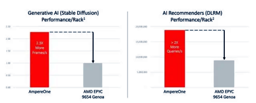 根據(jù)Ampere展示的產(chǎn)品性能對比,在生成式AI負載的文本提示生成圖像模型Stable Diffusion推理中,AmpereOne以每機架性能高出2.3倍優(yōu)勢領(lǐng)先AMD霄龍9654處理器。Ampere未提供與英特爾芯片對比數(shù)據(jù)。