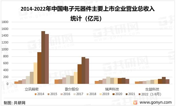 2014-2022年中國電子元器件主要上市企業營業總收入統計(億元)