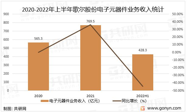 從電子元器件業務收入來看,2021年歌爾股份電子元器件業務收入完成769.5億元,同比增長36.12%,2022年上半年歌爾股份電子元器件業務收入已完成428.3億元。