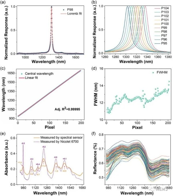 在實際應用之前,研究人員首先分析了該光譜傳感器的實際光譜性能,相關結果如圖2所示。圖2a和圖2b展示了900 nm ~ 1700 nm范圍中部分像素對單色光的歸一化光譜響應,具有典型的洛倫茲-高斯分布(Lorentz–Gauss distribution)帶通特征,且截止值小于OD2。圖2d展示了所有可用像素的半峰全寬(FWHM)。該光譜傳感器的基本性能可以與商用InGaAs便攜式光譜儀相媲美。