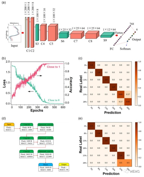 在這項研究中,研究人員還想要證明部署于邊緣(集成在傳感器中)的深度學習光譜分析模型可以達到與部署于計算機的傳統算法相同的效果。首先,建立基于卷積神經網絡(CNN)的綠茶摻糖識別模型,并在計算機上進行了驗證。隨后,將驗證后的模型進一步部署到集成于InGaAs光譜傳感器的芯片處理器上,用于綠茶摻糖的邊緣識別。相關結果如圖3所示。